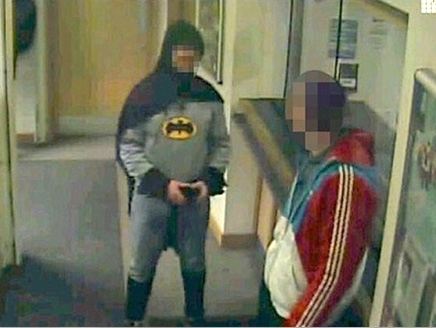 CCTV images released by police show a caped crusader — fully clad with the comic hero’s boots, gloves and logo across his chest — standing alongside a man in a red hooded sweatshirt.