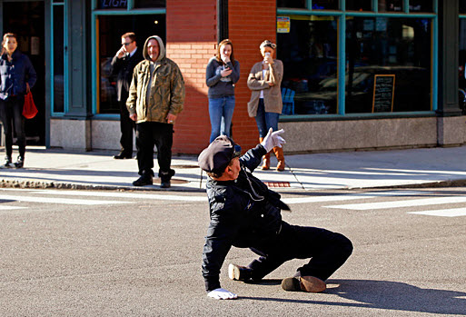 Standing in traffic, he adjusts his cap, shakes his hip, raises and twists one leg and spins. In one of the more unusual moves, he bends his knees, leans far back and quickly alternates support for his body by keeping one hand on the ground while motioning to the traffic with the free hand.