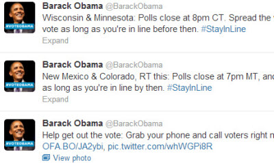 His campaign team fired messages to those Twitter followers located in states that were still voting, reminding them to stay in line even if polling stations had officially closed.