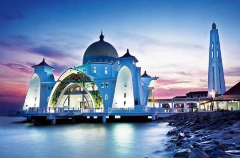 Not far from the river is another marvel, the Masjid Selat Melaka Mosque. It is also known as the Floating Mosque because, built on stilts on the man-made island of Pulau Melaka in the Malacca Straits Sea, at high tide it appears to be floating on water.